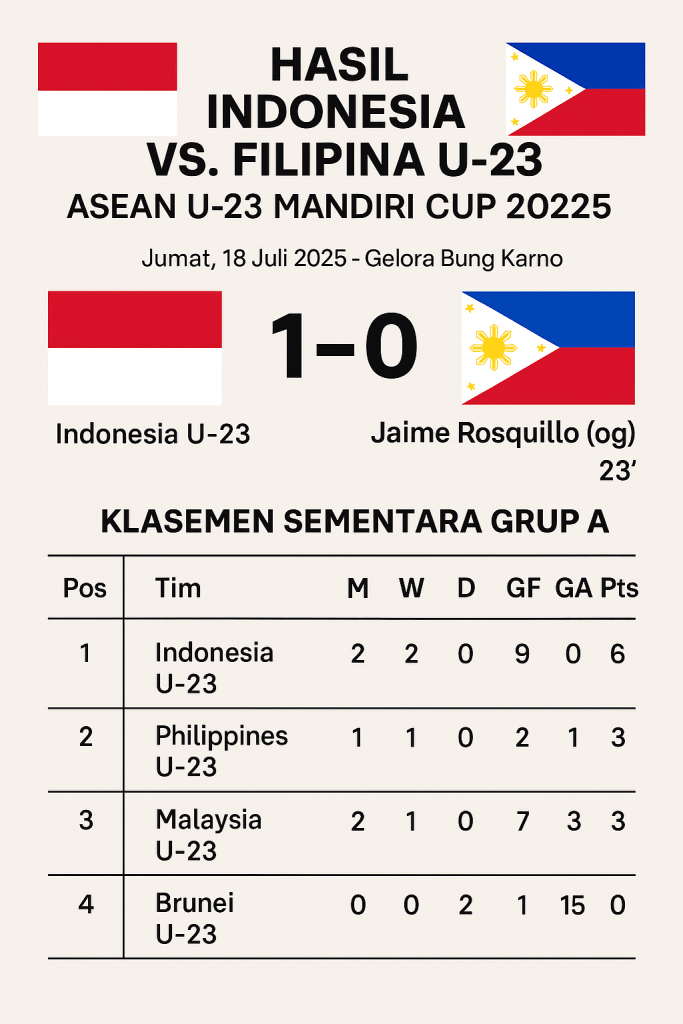 Pada laga Grup A yang digelar pada Jumat, 18 Juli 2025 di Gelora Bung Karno, Tim Garuda Muda Indonesia U‑23 memetik kemenangan tipis 1–0 atas Filipina U‑23. Gol tunggal kemenangan dicetak melalui gol bunuh diri pemain Filipina, Jaime Rosquillo, pada menit ke‑23.