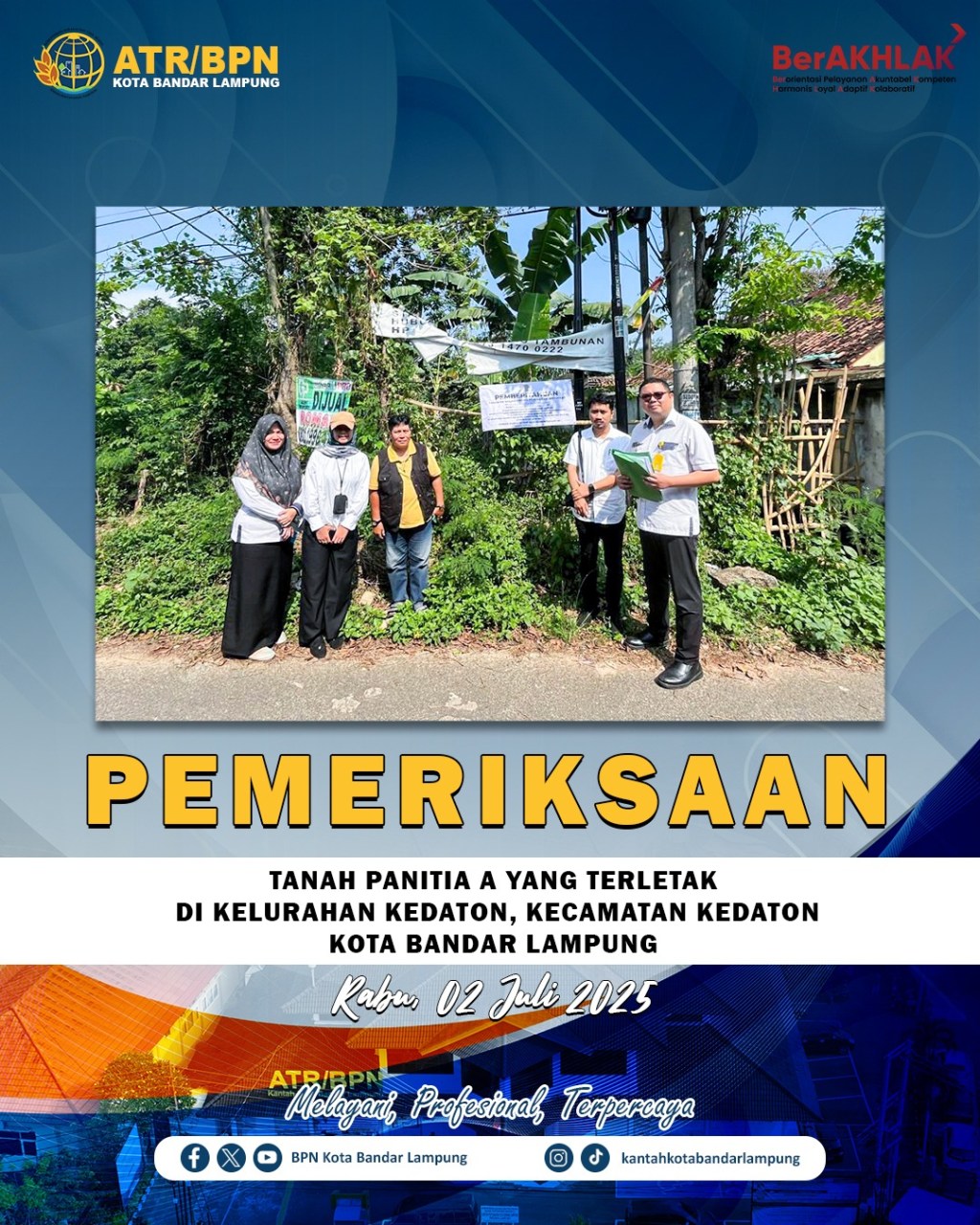 wilayah Kota Bandar Lampung yaitu di wilayah Way Laga, Kecamatan Sukabumi, di wilayah Kelurahan Sukabumi, Kecamatan Sukabumi, dan di wilayah Kedaton, Kecamatan Kedaton Kota Bandar Lampung. (2/7/2025). Kegiatan Panitia A ini merupakan salah satu kegiatan rutin yang dilakukan oleh Kantor Pertanahan Kota Bandar Lampung sebagai bentuk upaya memberikan perlindungan hak atas tanah bagi masyarakat di Kota Bandar Lampung