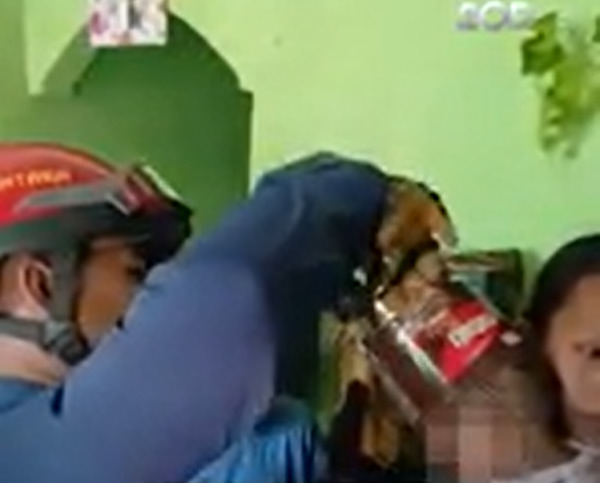 Dalam video yang diterima beredar terlihat beberapa orang termasuk petugas dari Damkarmat Kota Bandar Lampung dan orang tua batita berupaya mencabut kaleng biskuit tersebut.