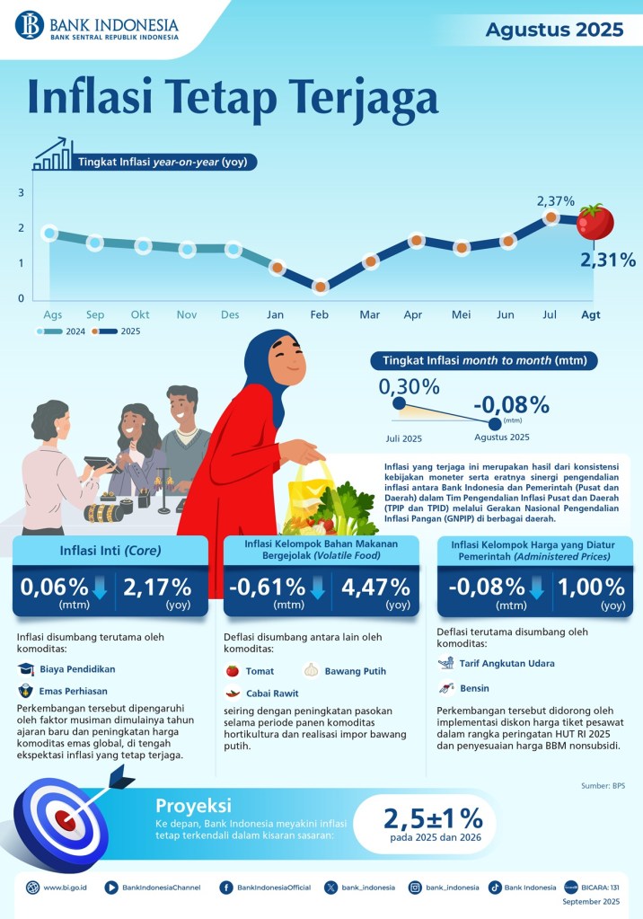 Dari data publikasi Bank Indonesia yang dikeluarkan oleh Departemen Komunikasi Bank Indonesia tanggal 1 September 2025, Inflasi Indeks Harga Konsumen (IHK) pada Agustus 2025 tetap terjaga dalam kisaran sasaran 2,5±1%. Berdasarkan data Badan Pusat Statistik, IHK Agustus 2025 tercatat deflasi sebesar 0,08% (mtm), sehingga secara tahunan inflasi IHK menurun menjadi 2,31% (yoy). Deflasi didorong oleh kelompok volatile food dan administered prices. Inflasi yang terjaga ini merupakan hasil dari konsistensi kebijakan moneter serta eratnya sinergi pengendalian inflasi antara Bank Indonesia dan Pemerintah (Pusat dan Daerah) dalam Tim Pengendalian Inflasi Pusat dan Daerah (TPIP dan TPID) melalui Gerakan Nasional Pengendalian Inflasi Pangan (GNPIP) di berbagai daerah. Ke depan, Bank Indonesia meyakini inflasi akan tetap terkendali dalam kisaran sasaran 2,5±1% pada 2025 dan 2026
