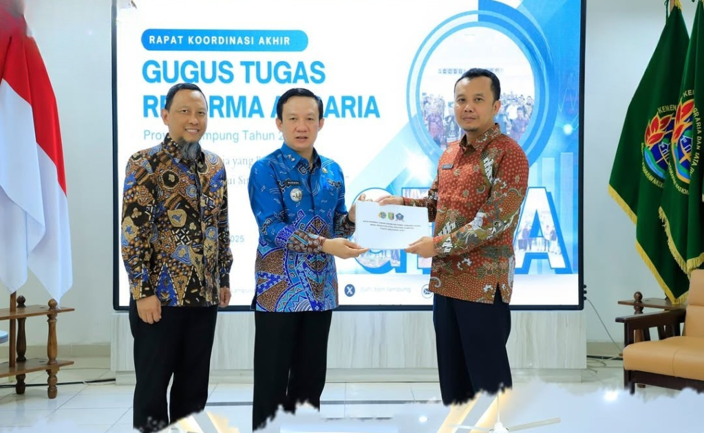 Pada Kamis (18/09/2025) Kegiatan Rapat Koordinasi Akhir Pelaksanaan Gugus Tugas Reforma Agraria (GTRA) Provinsi Lampung Berlangsung di Kantor Wilayah BPN Provinsi Lampung. Rapat ini dihadiri oleh Sekretaris Daerah Provinsi Lampung Bapak Dr. Marindo Kurniawan, S.T.,M.M., Direktur Landreform Bapak Rudi Rubijaya, S.P., M.Sc., Kepala Kantor Wilayah BPN Provinsi Lampung Bapak Hasan Basri Natamenggala, S.H., M.H. dan stakeholder terkait.
