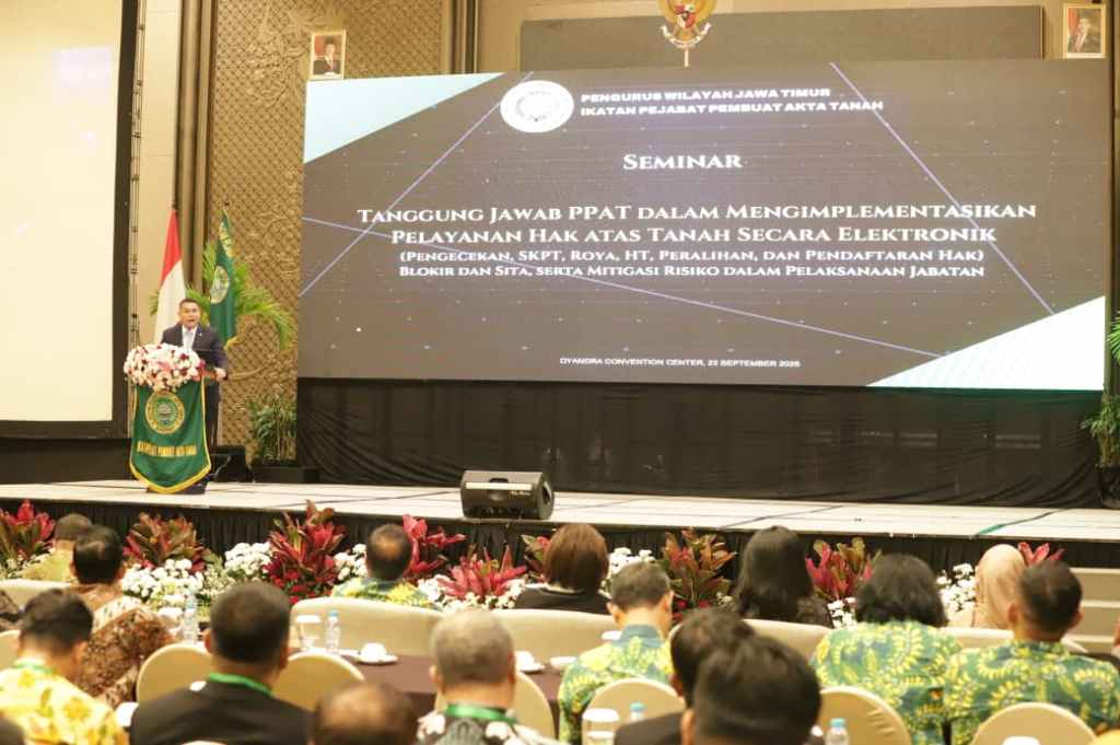 Surabaya – Wakil Menteri Agraria dan Tata Ruang/Wakil Kepala Badan Pertanahan Nasional (Wamwn ATR/Waka BPN), Ossy Dermawan, menegaskan pentingnya kolaborasi antara Kementerian ATR/BPN dan Ikatan Pejabat Pembuat Akta Tanah (IPPAT) dalam mempercepat transformasi layanan pertanahan di Indonesia. Ia menyatakan hal itu saat menjadi pembicara kunci dalam Seminar Pengurus Wilayah (Pengwil) Jawa Timur IPPAT, di Dyandra Convention Center, Surabaya, Senin (22/09/2025).
