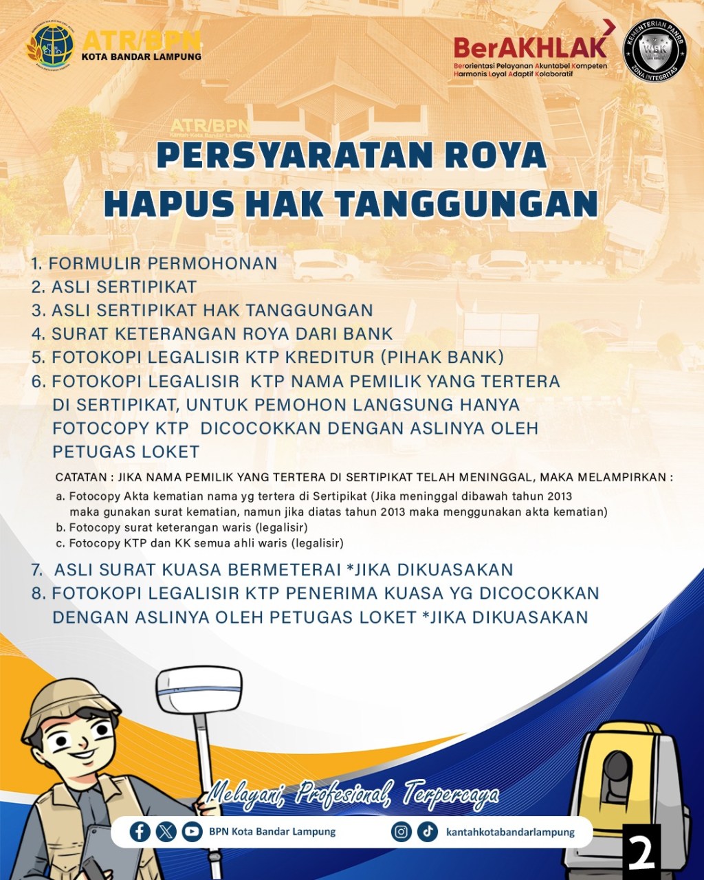 Dalam sosialisasi tersebut, Kantor Pertanahan Kota Bandar Lampung juga mempublikasikan secara rinci persyaratan pengajuan roya, mulai dari formulir permohonan, sertipikat asli, Sertipikat Hak Tanggungan, surat keterangan roya dari bank, hingga dokumen identitas para pihak. Informasi tambahan juga disampaikan bagi kasus pemilik sertipikat yang telah meninggal dunia, dengan melampirkan dokumen kewarisan sesuai ketentuan.